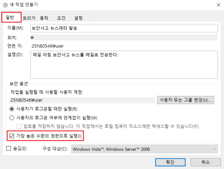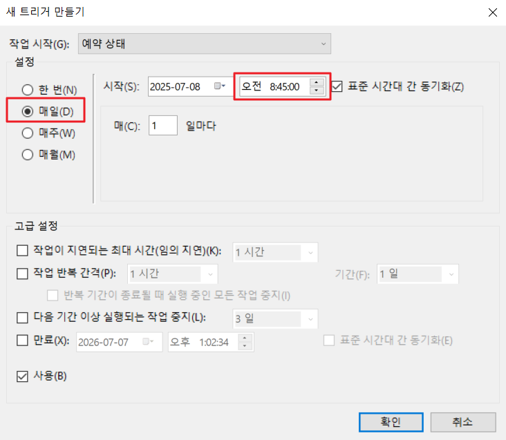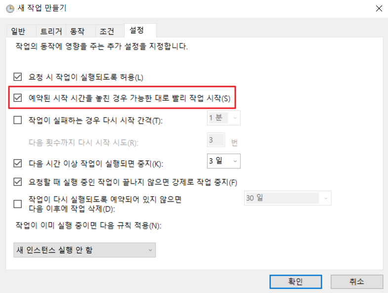 - 혹시 지정한 시간에 컴퓨터가 꺼져있을 경우를 대비해, 표시한 옵션도 체크해준다.